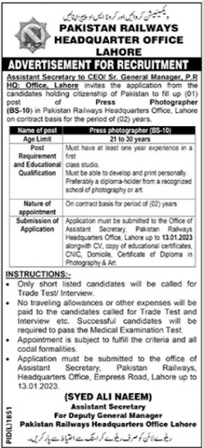 railways headquarter office Lahore invites application from eligible candidates